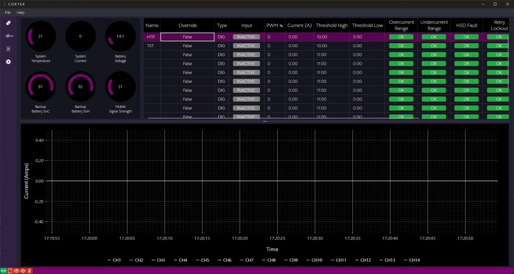 I should really get into the habit of posting more frequently than every two years. My goal for the Spitfire for 2025 was to get the engine running on fuel injection. I have been busy throughout the year behind the scenes, working on my new Power Distribution Module (PDM) and changing the way the fuel system is set up. This time the PDM has 14 channels and runs all the circuits in the car. It’s now at the point where I can configure each channel, set the current limit, pair channels, and it deals with overcurrent faults. I can also override channels manually, so the first test—prime the fuel system which is configured as so: