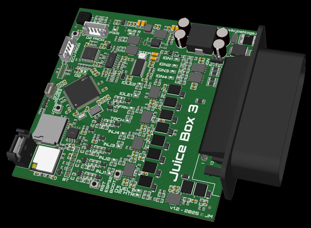 It was idling quite fast, around 2500RPM. I suspect this is probably the vacuum tubing leaking since each runner is linked to a manifold which is linked to the fuel pressure regulator and the ECU MAP sensor. I think I’ll remove this for now, see if my idle comes down and just set the car up using throttle position only. The Juice Box 2 ECU I developed in 2023 is pretty much redundant now already since the Teensy 3.5 microcontroller it’s based on is end of life. The Juice Box 3 is in development and this time is STM32 based. STM have long term commitments to manufacturing their processors so this is a safer bet. It’ll have a few new features including a built in wideband O2 sensor controller and PWM stepper control so I can add an Idle Air Control Valve (IACV) down the line if I need it. This allows closed-loop control of the idle speed by controlling auxiliary air flow into the inlet runners. I think, between closed loop fuel mixture control with the O2 sensor, inlet air temperature and barometric corrections from the on-board barometric sensor, I can get the car running 90% of the way I’d want it to on throttle position alone, rather than a mix of that and manifold pressure.
